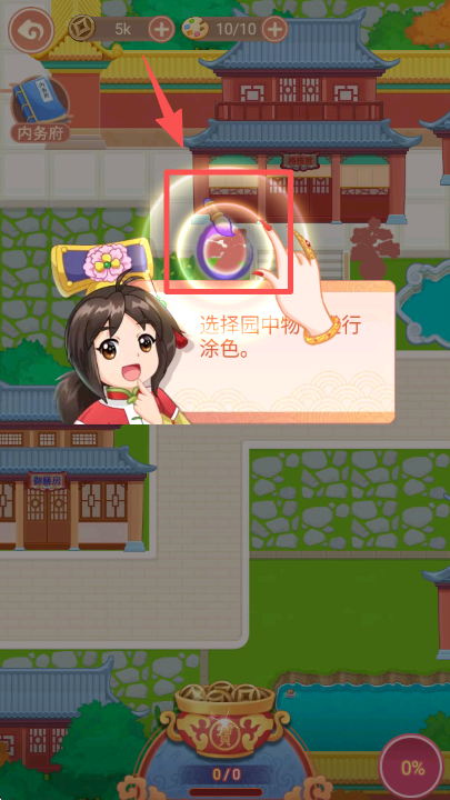 4、根据指引选择园中的目标景物,点击该景物开始进行涂色操作。