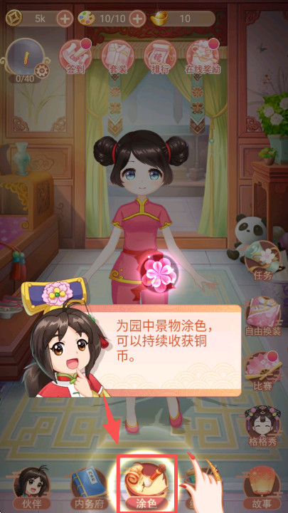 3、点击界面下方的 “涂色” 按钮,开启为园中景物涂色的任务并获取铜币。