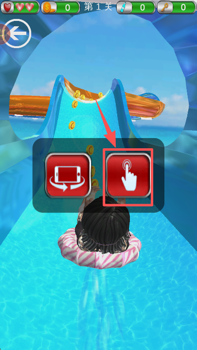 4、进入关卡 1 后,点击界面中的手指图标按钮,操控角色在水上滑梯进行跑酷动作。