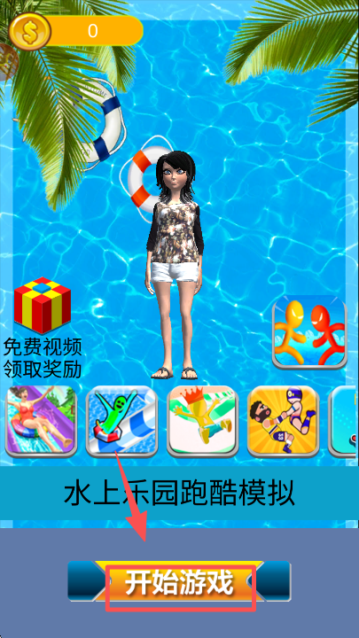 1、在 “水上乐园跑酷模拟” 的启动界面,点击下方黄色的 “开始游戏” 按钮,进入游戏的角色选择页面。