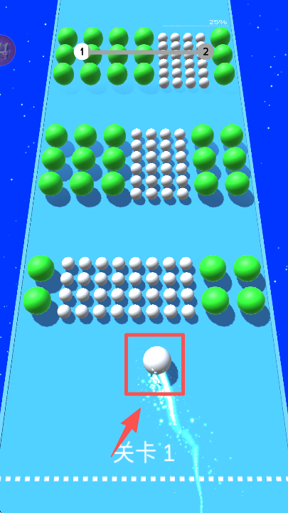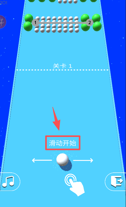 1、在关卡 1 的界面中,滑动 “滑动开始” 区域,启动白色弹珠的发射流程,进入弹珠撞击的游戏环节。