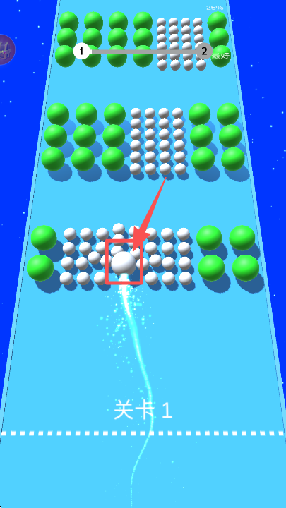2、操控发射后的白色弹珠在赛道上移动,精准撞击上方的绿色弹珠堆,逐步推进关卡的进度。