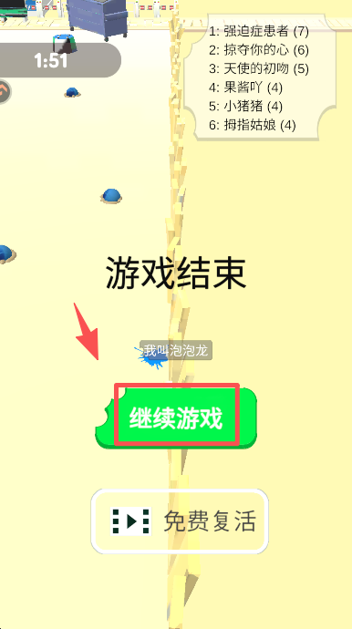 4、游戏结束后,点击 “继续游戏” 按钮,开启新一轮的海滨泡泡龙对局。