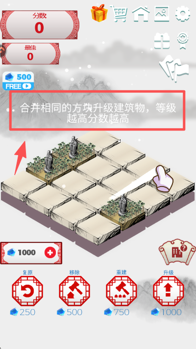 4、查看游戏规则提示,将相同方块合并升级建筑物,以此获取更高分数。