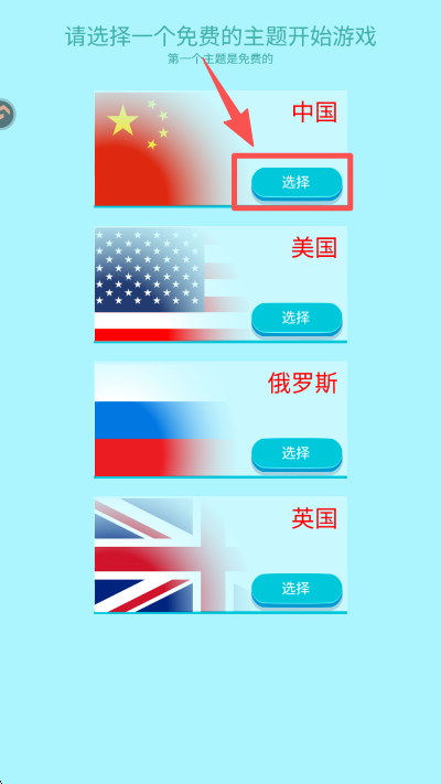 1、在主题选择界面,点击 “中国” 对应的 “选择” 按钮,选定免费主题进入游戏。