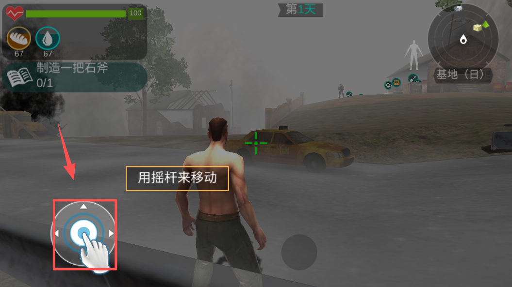 1、使用虚拟摇杆控制角色移动,探索游戏世界,寻找资源和目标地点。