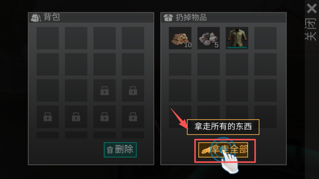 3、在物品栏界面,点击“拿走全部”按钮,快速拾取所有可携带物品。