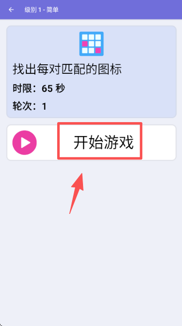 3、在级别 1 - 简单的界面中,点击 “开始游戏” 按钮,进入找图标配对的游戏环节。
