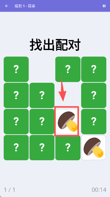 4、在 “找出配对” 游戏里,点击界面中显示的蘑菇图标,寻找与其匹配的对应图标完成配对。