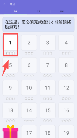 2、进入级别选择页面后,点击 “1” 对应的关卡,进入级别 1 的游戏准备界面。