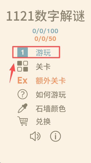 1、在 “1121 数字解谜” 主界面,点击标注 “1” 的 “游玩” 按钮,进入关卡 1 的解谜界面。