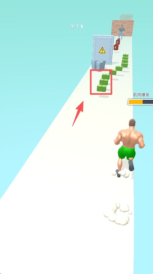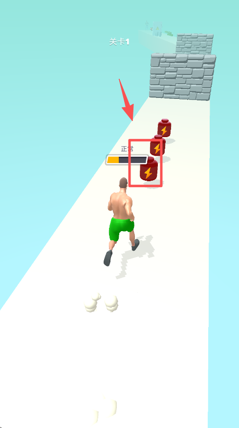 2、进入关卡 1 后,操控肌肉男靠近红色能量罐,收集能量来提升肌肉爆发进度条。