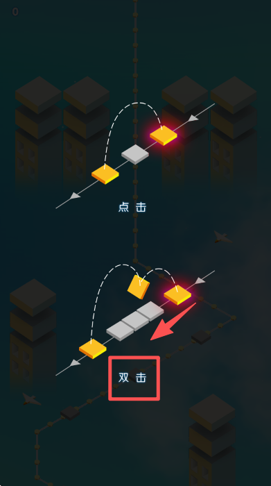 2、在游戏操作关卡中,按照提示对对应方块执行点击或双击操作,推进白块的滚动进程。
