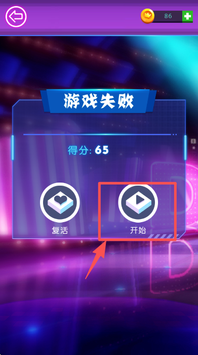4、游戏失败后,在失败界面点击 “开始” 按钮,重新进入 “滚动白块” 的游戏操作关卡。