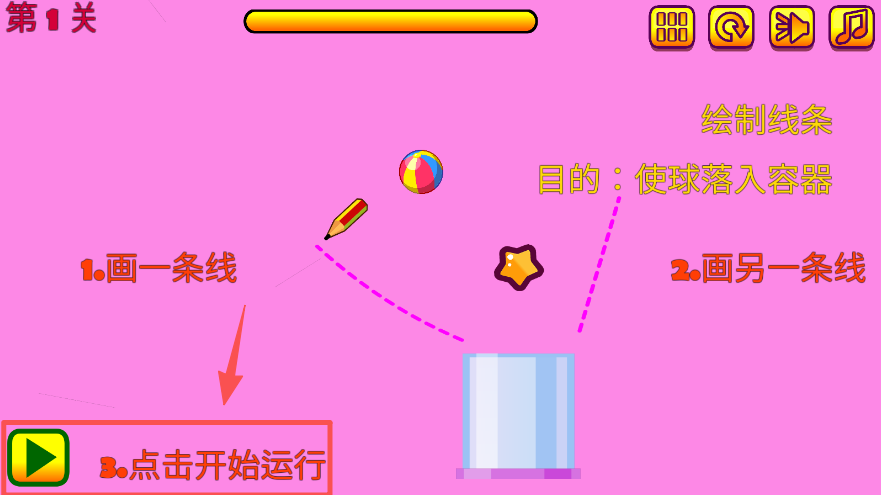 4、进入第 1 关后,按提示绘制线条,再点击 “开始运行”,让球顺着线条落入容器。