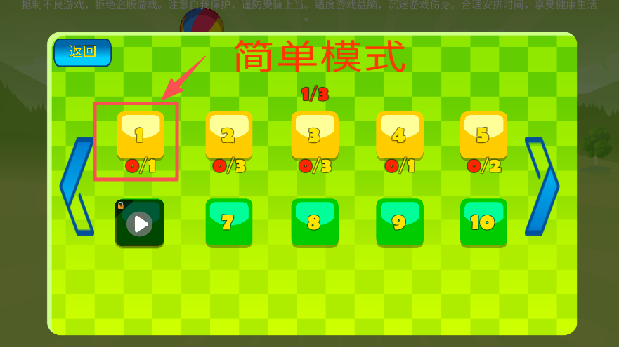 3、在简单模式的关卡页,点击标有 “1” 的关卡选项,进入第 1 关的游戏操作界面。