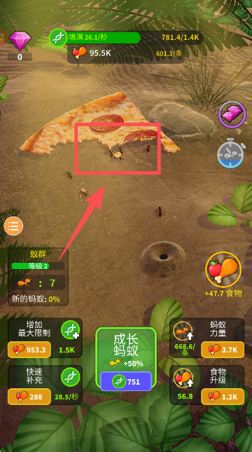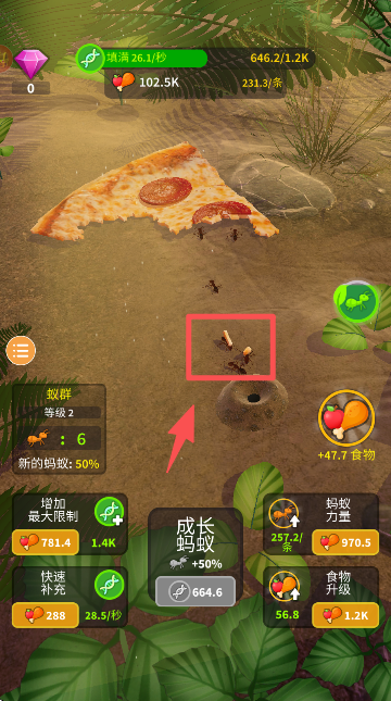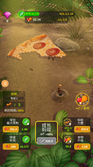 3、观察蚁群搬运披萨的过程,持续积累资源,为后续的蚁群成长和升级做准备。