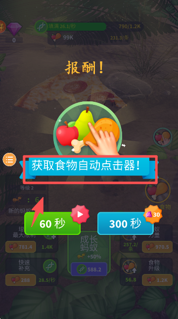 4、在新的 “报酬” 界面,选择对应时长选项,获取食物自动点击器,提升资源获取效率。