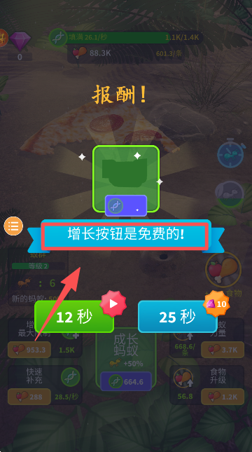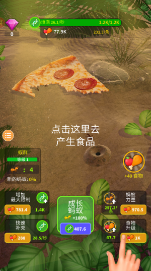 1、点击界面中出现的食物道具,收集资源的同时助力蚁群等级提升,新蚂蚁占比增加。