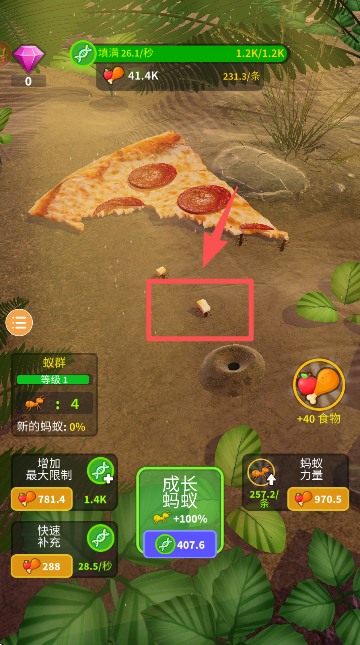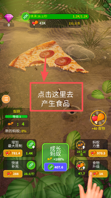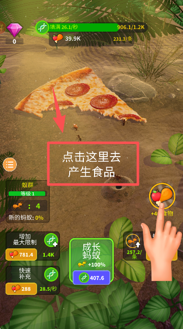 2、点击 “产生食品” 相关区域,获取食物资源,为蚁群成长和升级提供物资支持。