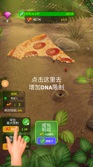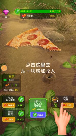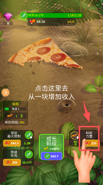 1、在游戏界面,点击 “蚁量升级” 按钮消耗资源,提升蚁群的数量上限,增加收入来源。