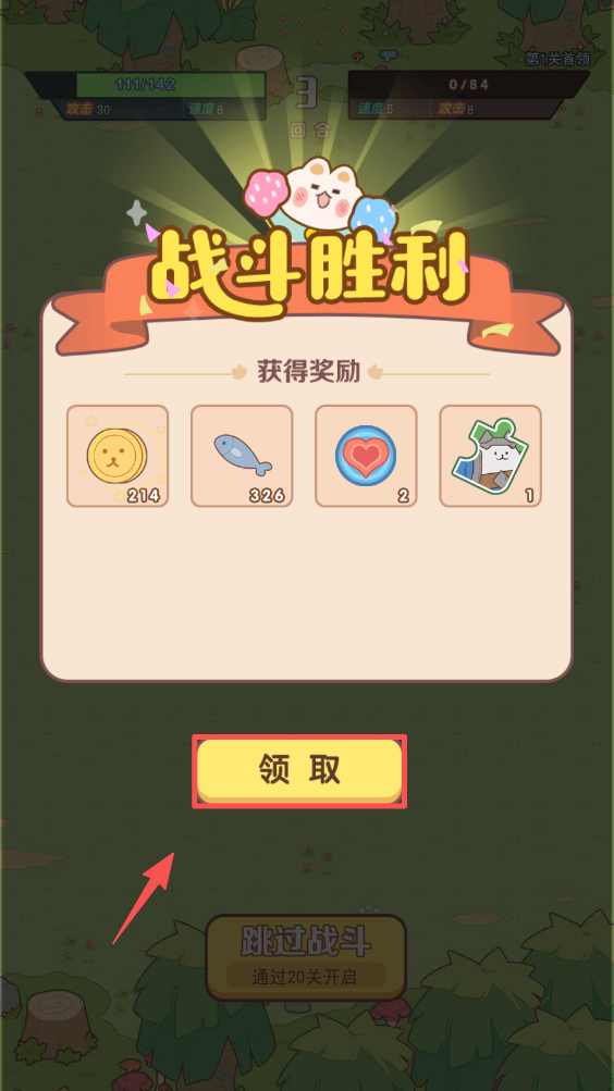 4、战斗胜利后,点击 “领取” 按钮,获取金币、鱼等奖励。