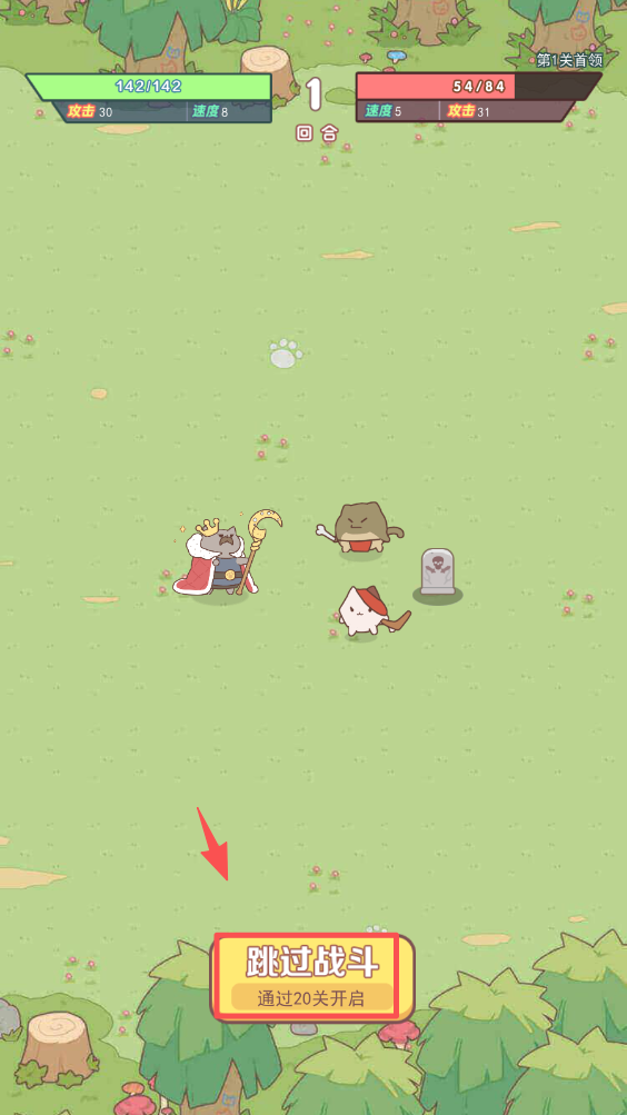 1、在战斗中,操控喵国王带领队伍与敌方野蛮喵首领作战,观察红色方框内的战斗交互区域。