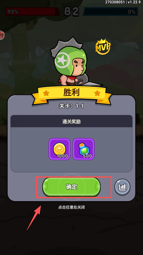 4、战斗胜利后,点击“确定”按钮领取通关奖励。恭喜你,成功通关并获得奖励。