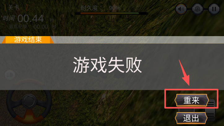 4、若游戏失败,点击 “重来” 按钮,重新开始当前关卡的驾驶挑战。