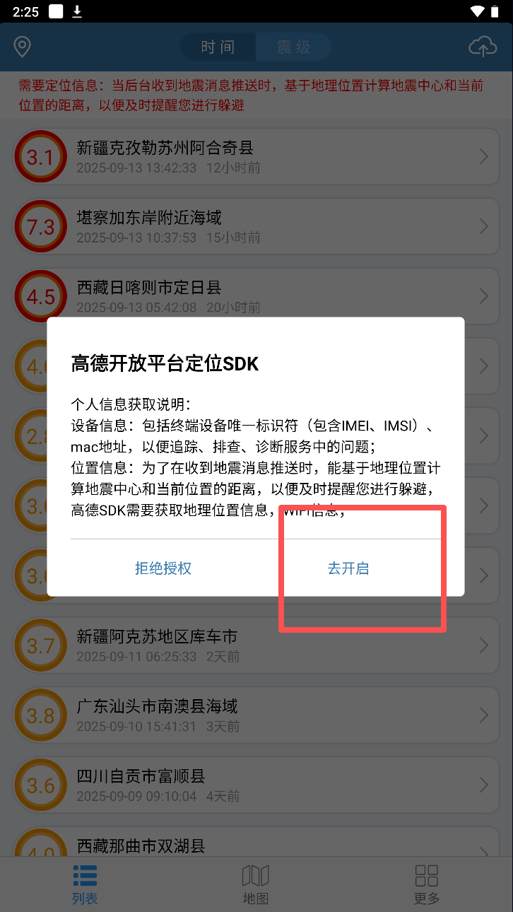2、在地震列表页面,点击“去开启”按钮授权高德开放平台定位SDK。
