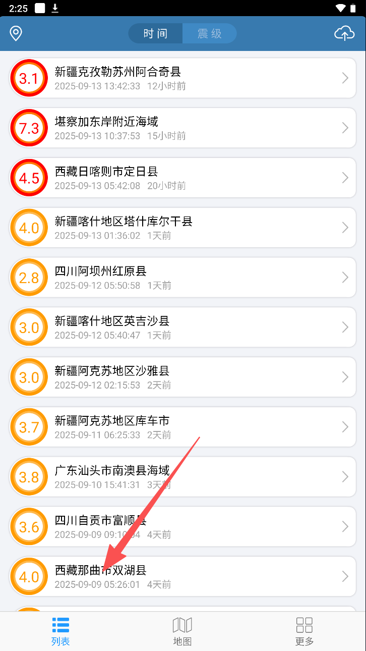 3、在地震列表中查看不同地区的地震发生时间和震级。