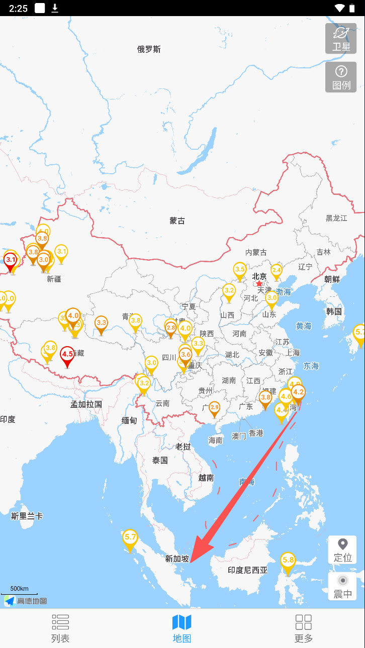 4、点击地图按钮,查看地震发生位置的地理分布情况。