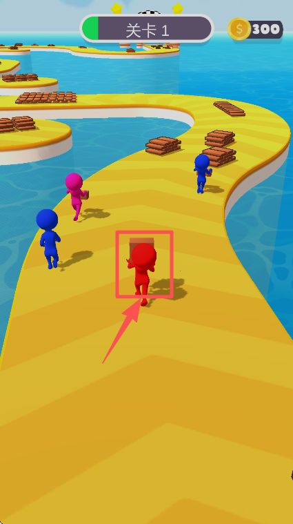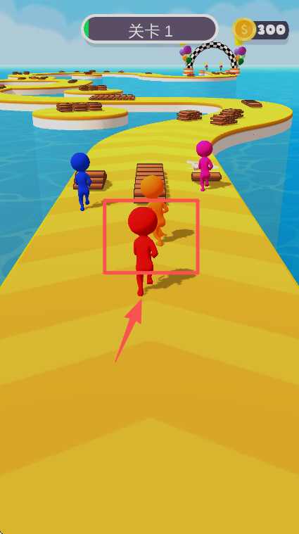 4、重新进入关卡后,操控红色角色拾取路径上的木板,跟随其他角色一同朝着终点方向前进。
