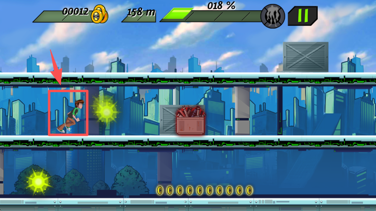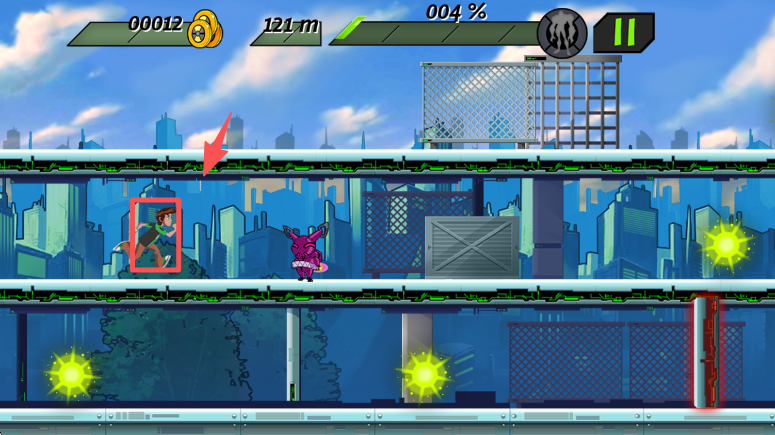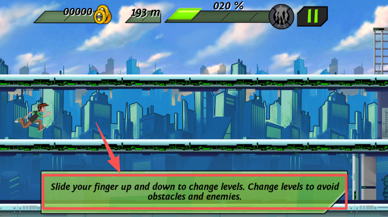 1、在游戏中看到提示后,用手指上下滑动屏幕,切换角色所在的层级,以此避开障碍和敌人。