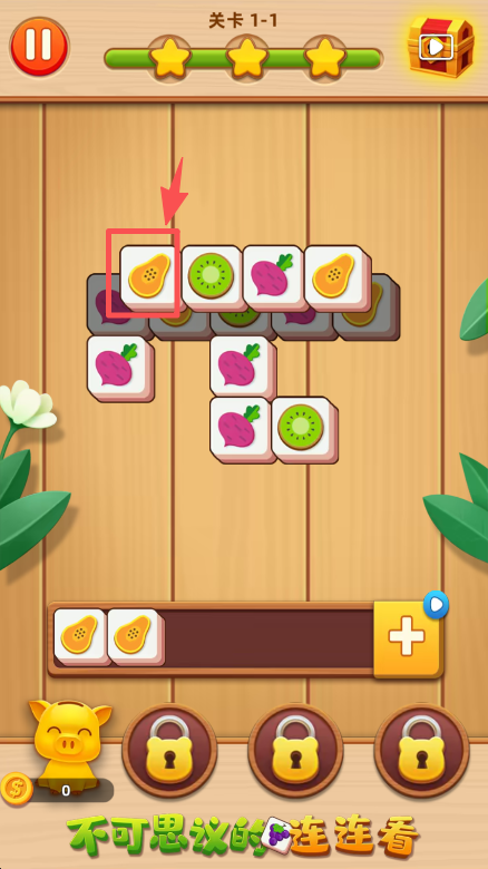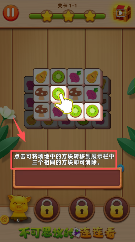 3、点击场地中的木瓜方块,移入展示栏,积累相同方块以推进消除进度。