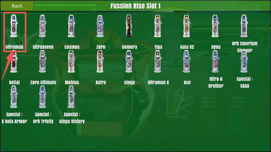 4、选好胶囊后,点击 “Fusion List” 选项,触发融合变身效果,体验对应的奥特曼形态。