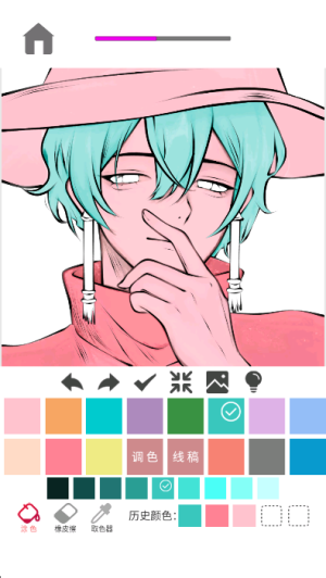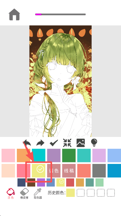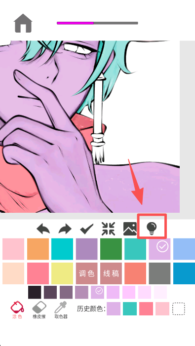 1、涂色时若不确定配色,点击 “灯泡” 按钮可获取配色参考,辅助完成涂色。