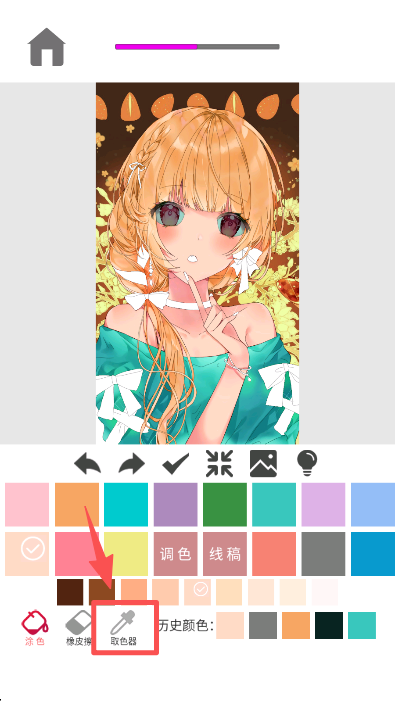 4、遇到想复用的颜色,点击 “取色器” 工具,可吸取已涂色区域的颜色继续使用。