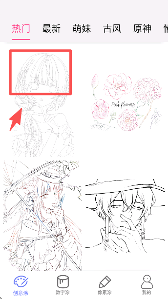 1、在软件首页选择想要涂色的线稿,如图中人物线稿,点击即可进入涂色界面。