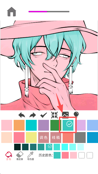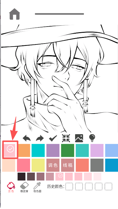 2、进入涂色界面后,先选好想要的颜色,点击颜色块就能开始给线稿填充色彩。