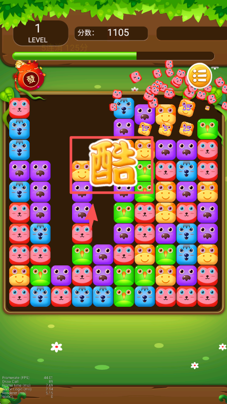 3、成功消除方块后会出现 “酷” 的提示,同时分数会对应增加。