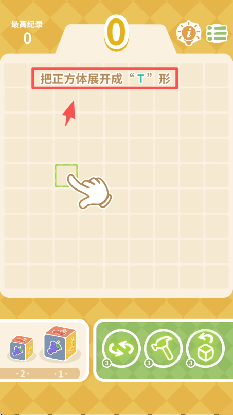 4、按照提示要求,将正方体展开成 “T” 形,跟随手指指引点击对应格子完成本次展开操作。