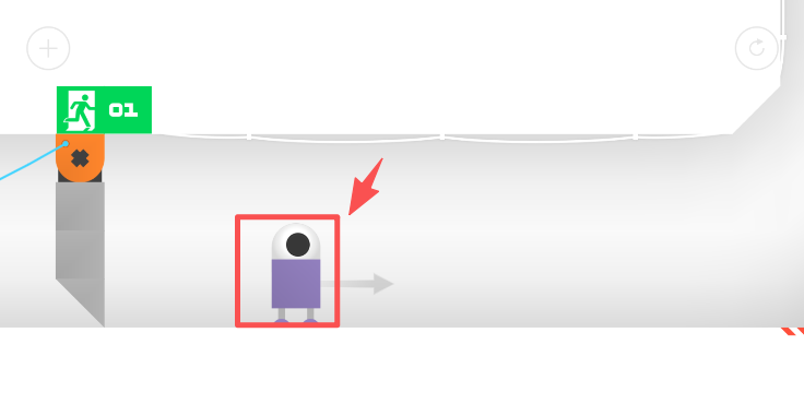 1、操控紫色机器人沿着通道向右移动,按照箭头指引推进,避开场景中的危险区域。