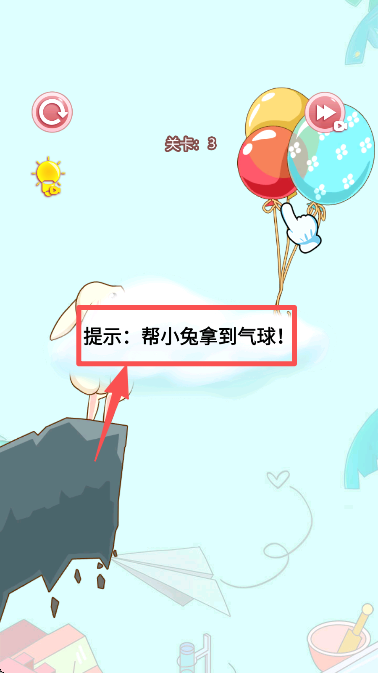 4、查看关卡 3 的提示 “帮小兔拿到气球”,明确本关卡的解谜目标并准备操作。
