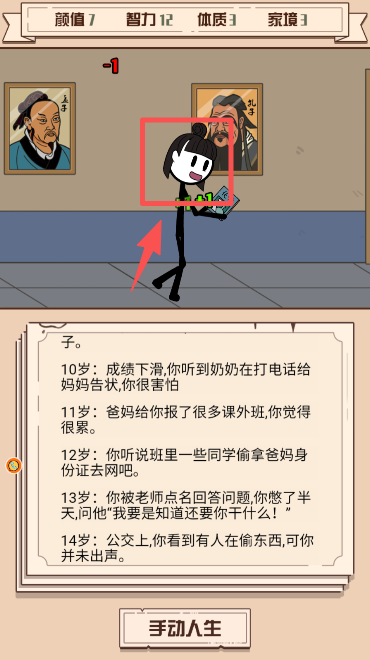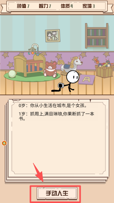 3、若想自主选择事件,点击 “手动人生” 按钮,手动参与火柴人的人生事件选择。