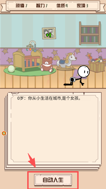 2、抓周后点击界面下方的 “自动人生” 按钮,可自动推进火柴人的人生成长进程。