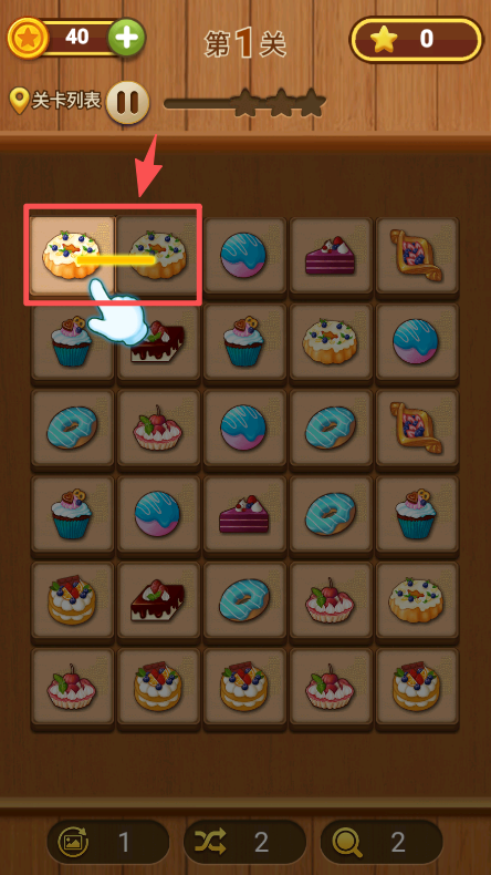4、进入第 1 关后,按照指引点击两个相同的蛋糕图标,完成这组图案的连连看消除操作。