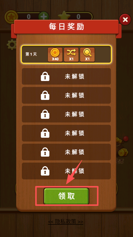 1、在每日奖励弹窗里,点击下方绿色的 “领取” 按钮,就能获取第 1 天对应的金币与道具奖励。