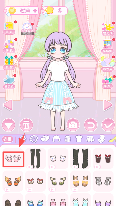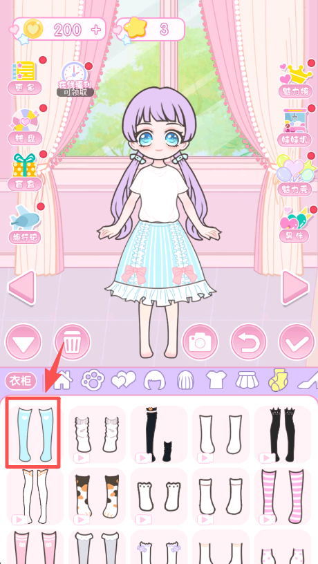 3、切换到鞋袜栏,选中浅蓝色长袜样式并点击,给角色换上对应的袜子装扮。