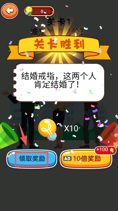 2、观察关卡 1 的人物,点击戴结婚戒指的男性角色,完成 “谁是她的老公” 的推理选择。